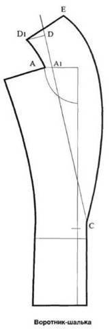 Первоначальные этапы построения такие же, как при построении классического (английского) воротника. DD1 = 5 см. D1E = 12 см. Подробнее...