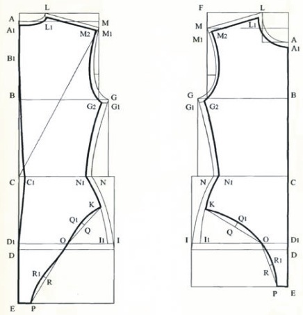 Проводим линии горловины, плеча, проймы и бокового шва по точкам А 1 L1 М2 G2 N1 К.